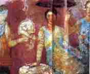 Γυναίκα στην «τουαλέτα» της. Λεπτομέρεια ρωμαϊκής πολύχρωμης τοιχογραφίας (Κατάνη, Αρχαιολογικό Ινστιτούτο), (Πηγή: Ιστορία Εικονογραφημένη, τεύχος 435, Σεπτέμβριος 2004, άρθρο «Παλλακίδες & ιερόδουλοι στην Αρχαία Μεσόγειο, Ιερές συντεχνίες – Ιδιωτικό Εμπόριο», Σταύρος Οικονομίδης, Αρχαιολόγος, σελίδα 70)